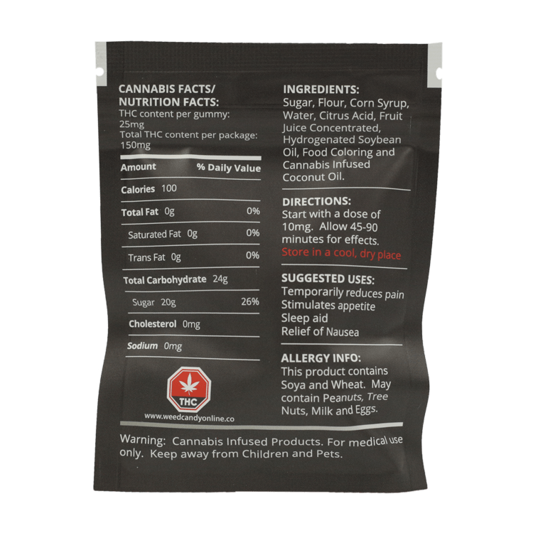 DOSAGE: Each Sour Rainbow Ropes is infused with 25mg. Begin with one candy and allow half an hour before ingesting more.