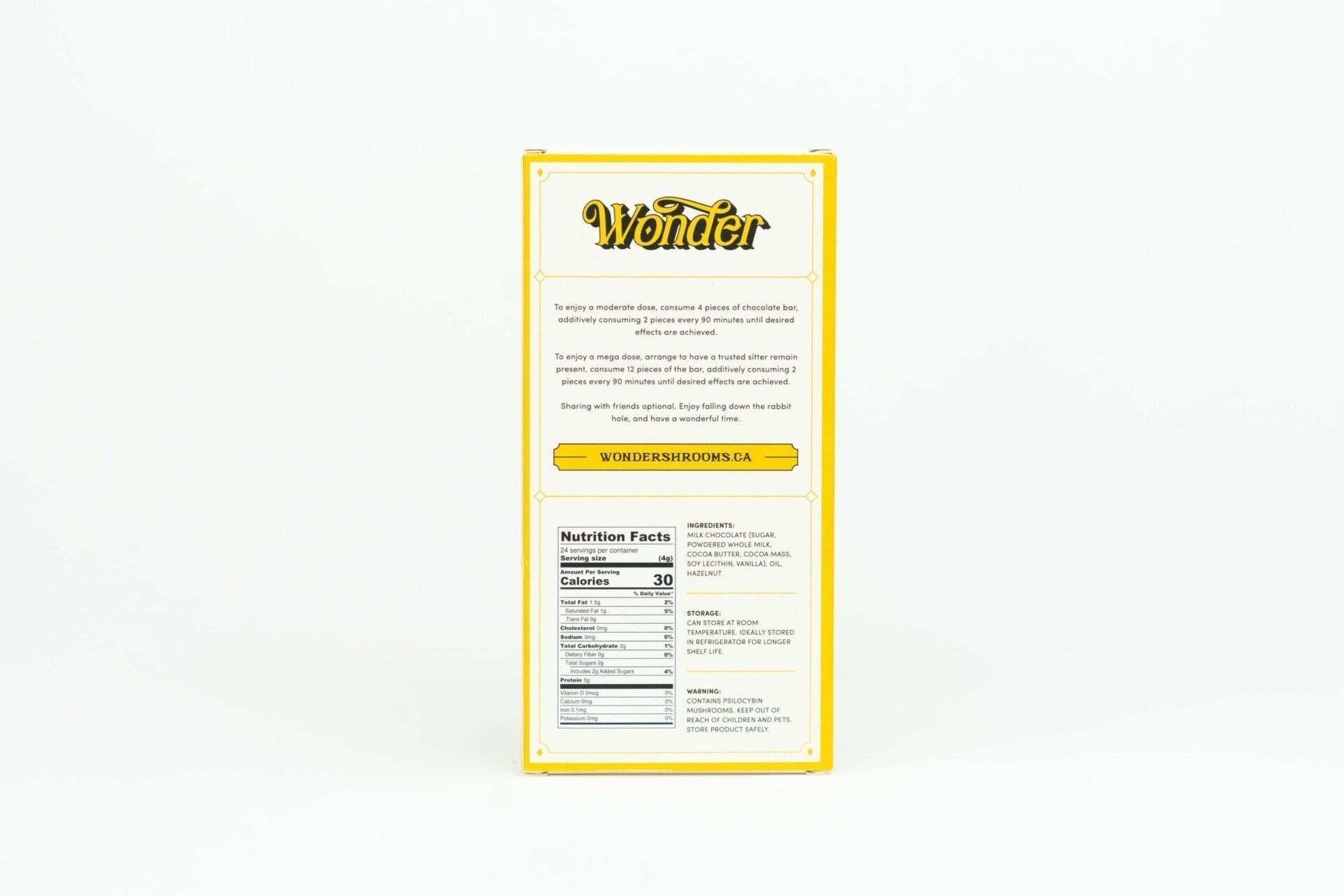 Are you ready to integrate psilocybin into your holistic wellness routine? Maybe you’re looking to microdose on a regular basis to enjoy the benefits of increased creativity, decreased anxiety and improved mood. Perhaps you’re looking to take your next philosophical discussion with friends to a whole new level with a museum dose. Or you might be looking to reset your ego and perspective of the world by taking a trip to wonderland with a mega dose. Whatever your motive, Wonder has you covered. To enjoy a moderate dose, consume 6 pieces of chocolate bar, additively consuming 3 pieces every 90 minutes until desired effects are achieved. To enjoy a mega dose, arrange to have a trusted sitter remain present, consume 18 pieces of the bar, additively consuming 3 pieces every 90 minutes until desired effects are achieved. Sharing with friends optional. Enjoy falling down the rabbit hole, and have a wonderful time.