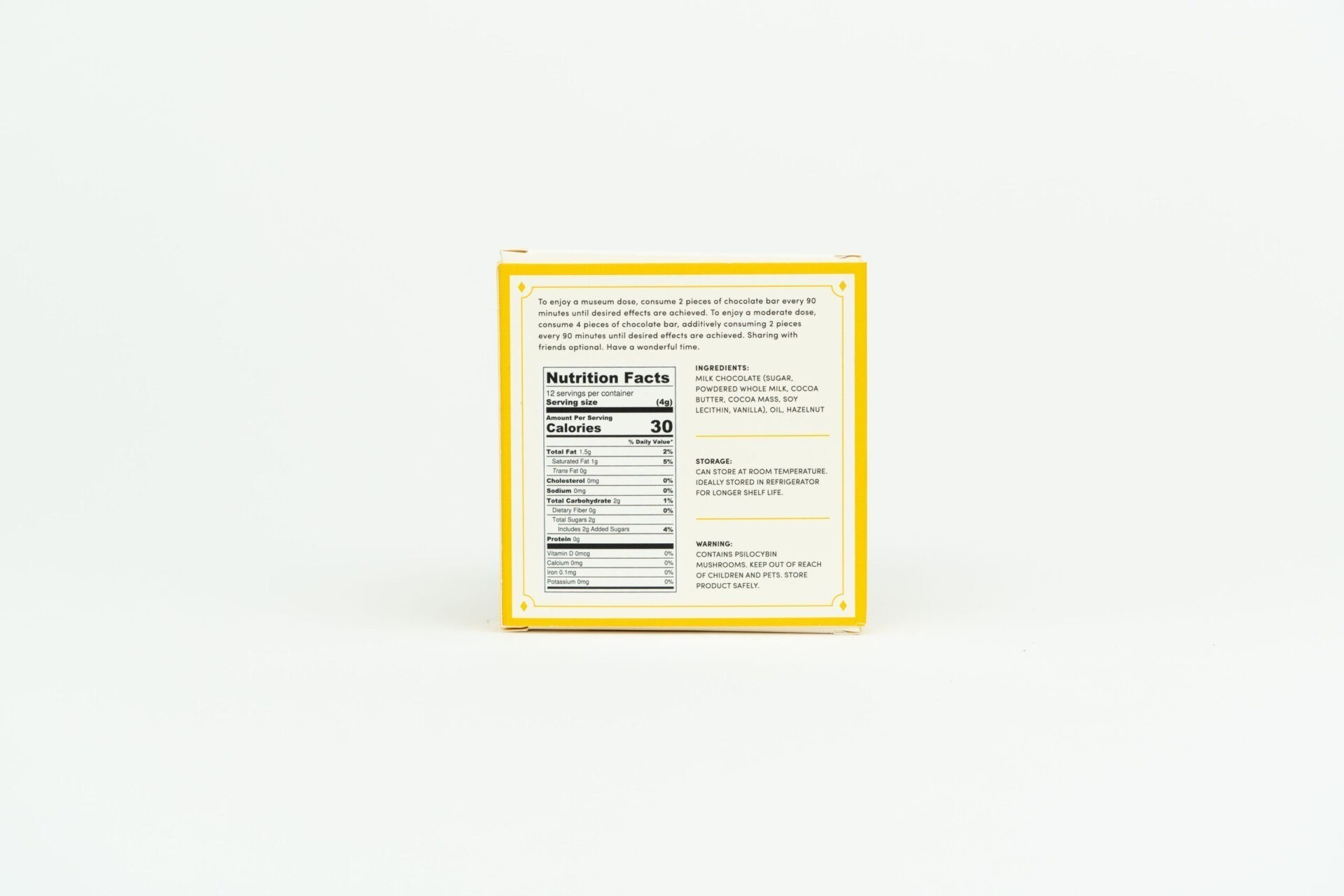 To enjoy a moderate dose, consume 6 pieces of chocolate bar, additively consuming 3 pieces every 90 minutes until desired effects are achieved. To enjoy a mega dose, arrange to have a trusted sitter remain present, consume 18 pieces of the bar, additively consuming 3 pieces every 90 minutes until desired effects are achieved. Sharing with friends optional. Enjoy falling down the rabbit hole, and have a wonderful time.